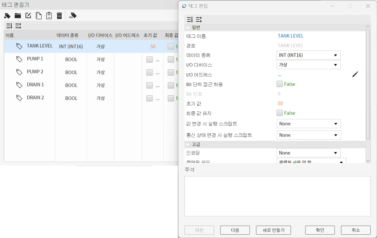 - 경보: **TANK - HIGH** ↔ 태그: **DRAIN 1**- 경보: **TANK - LOW** ↔ 태그: **PUMP 1**- 경보: **TANK - LOW LOW** ↔ 태그: **PUMP 2**