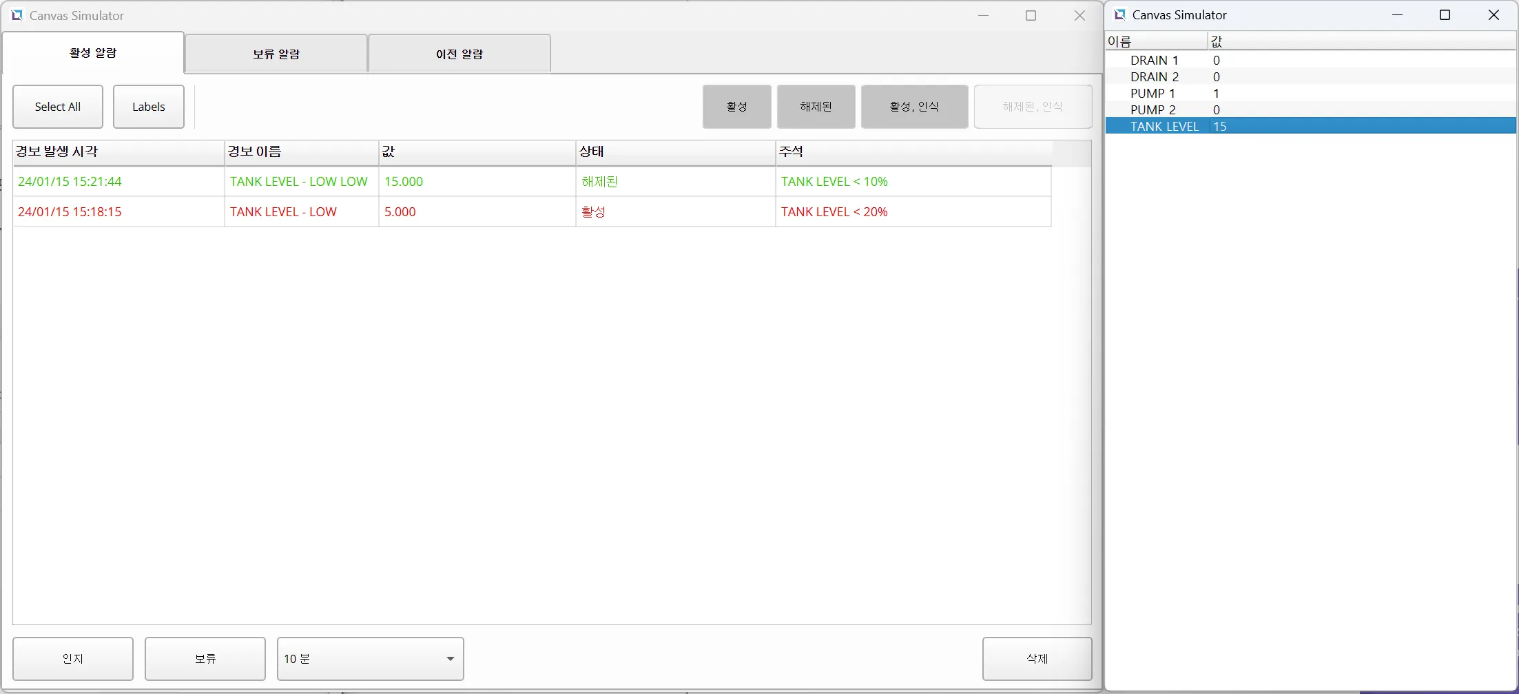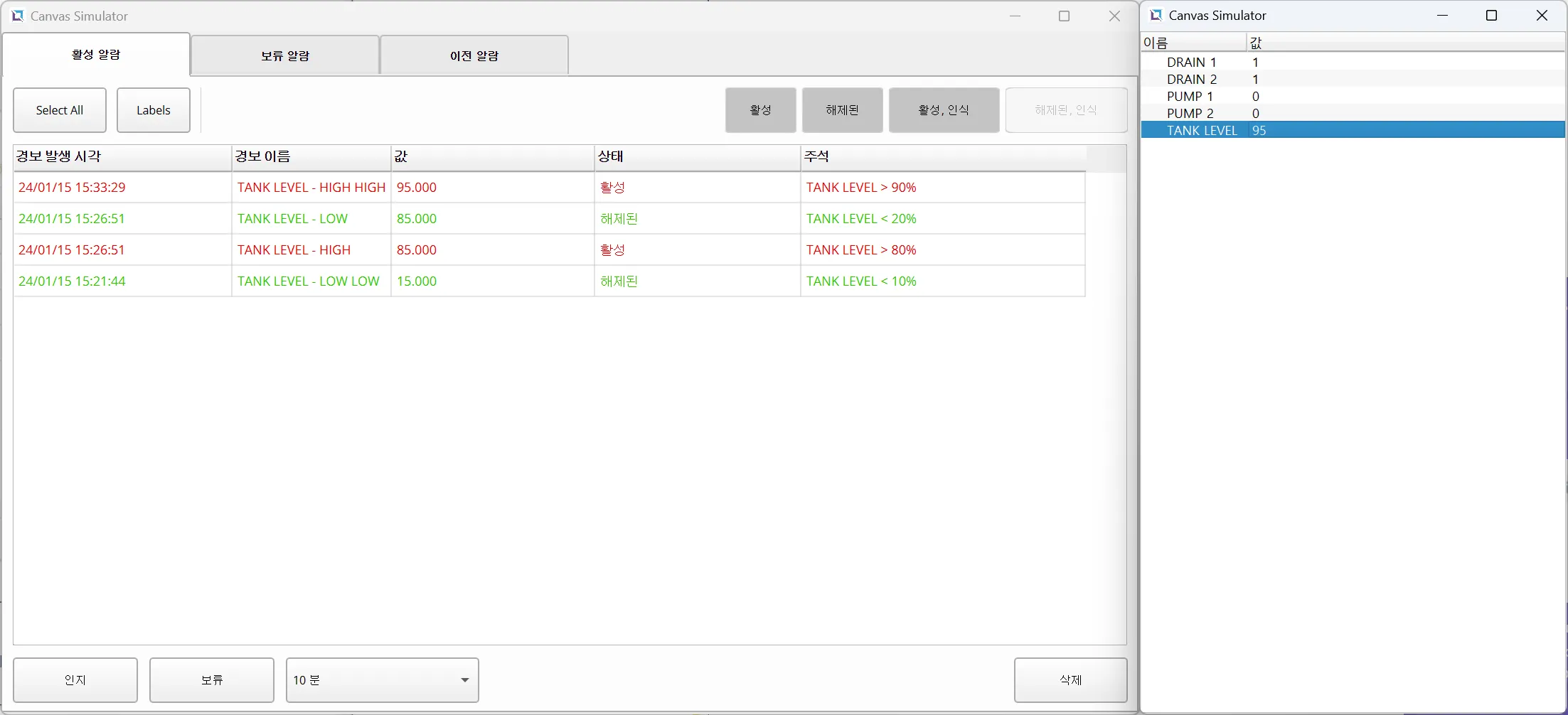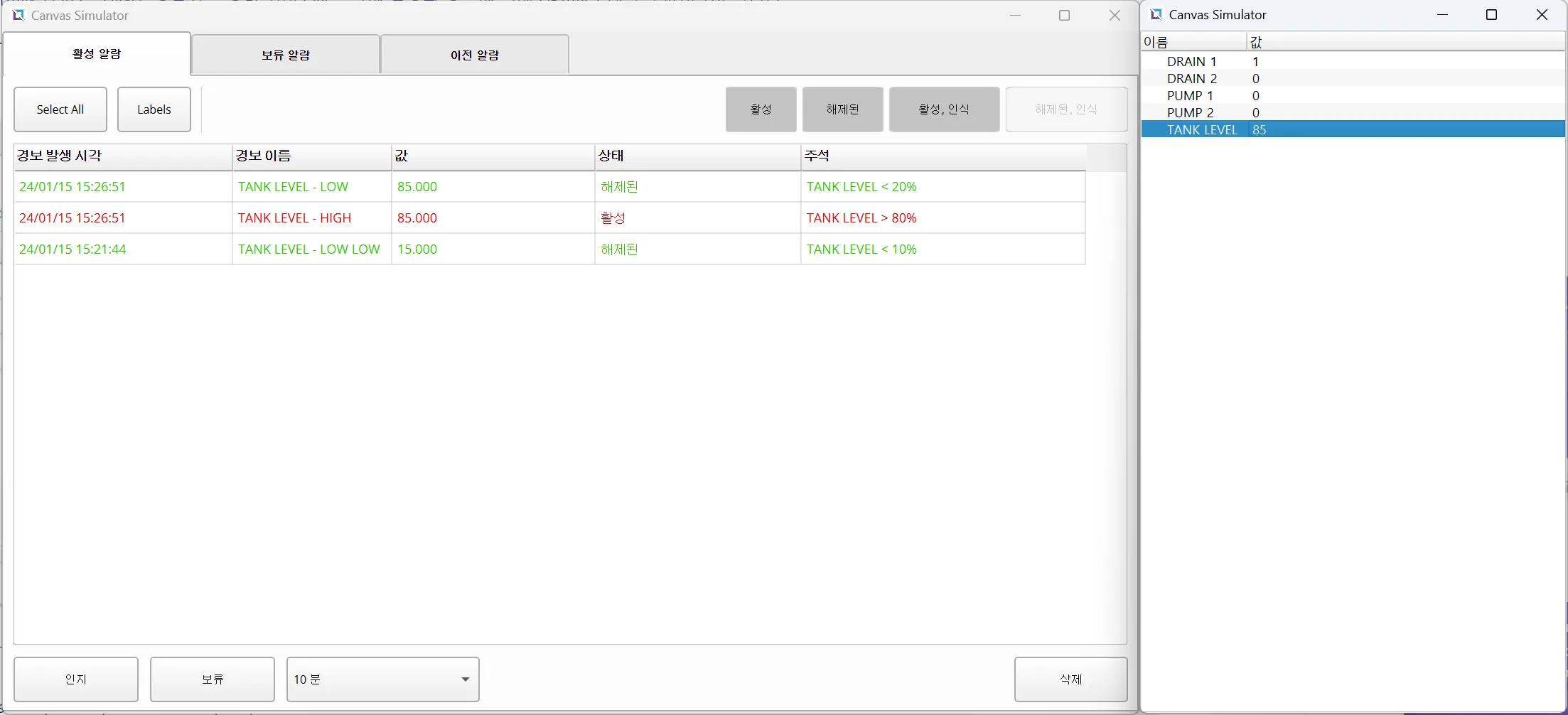 - TANK LEVEL 태그 값을 85로 설정하면 TANK LEVEL - LOW 경보가 해제되지만 TANK LEVEL - HIGH 경보가 활성화 되며 ON 동작에 설정된 명령에 의해 PUMP 1태그는 0으로, DRAIN 1 태그의 값이 1이 됩니다.