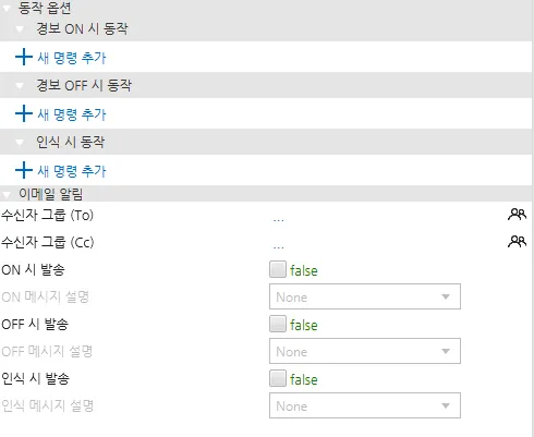 섹션 제목: “경보 동작”사용자는 경보 상태에 따른 동작을 별도로 지정할 수 있습니다. 경보 설정 탭에서 동작 옵션에 경보 ON 시 동작, 경보 OFF 시 동작, 인식 시 동작의 3가지 종류로 스크립트 또는 명령을 설정할 수 있습니다. 설정된 동작은 상태가 변경되었을 경우 동작하는 점 유의하여 주시기 바랍니다.