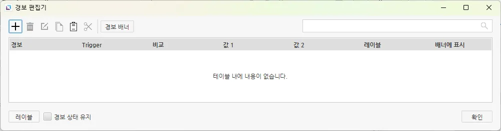 이 창에서는 프로젝트 내에 생성된 모든 경보의 이름, 발생 조건, 비교 조건, 비교에 사용되는 값, 레이블, 배너 표시 여부가 표시됩니다. 여기서 사용자는 원하는 경보를 추가, 수정, 복사, 붙여넣기 및 삭제를 할 수 있습니다.