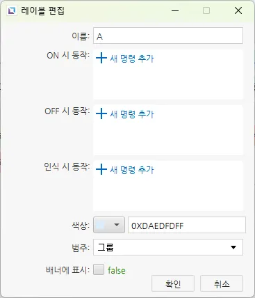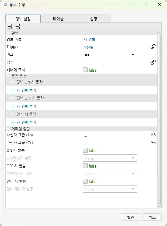이 창에서는 경보 설정, 레이블, 설명탭을 통해 경보를 설정할 수 있습니다.