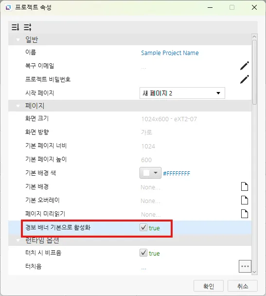 다른 옵션은 프로젝트 속성창에서 경보 배너 기본으로 활성화를 선택하면 모든 페이지에 경보 배너가 표시됩니다.