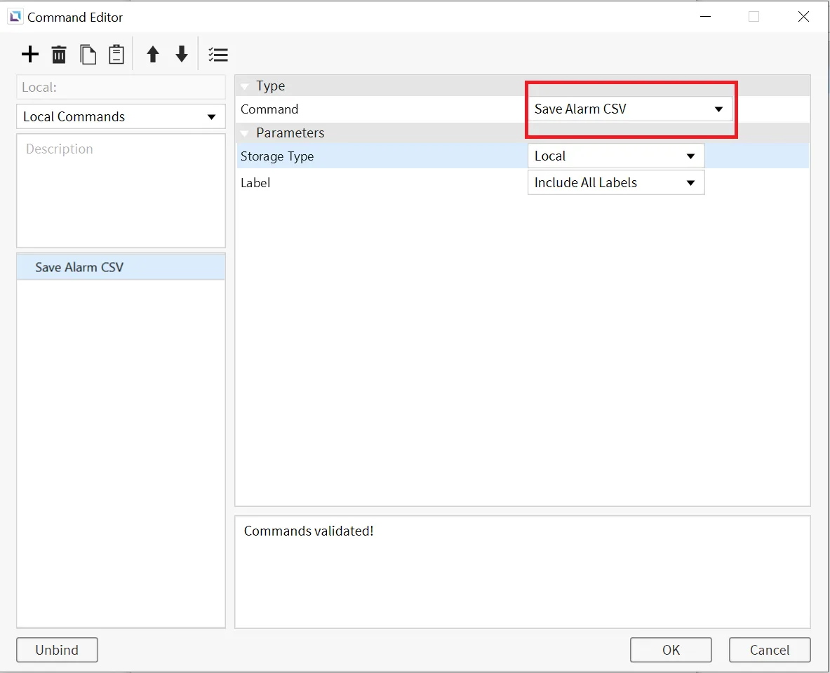 CSV 파일은 2가지 방법으로 생성이 가능합니다. 경보 CSV 저장 명령을 사용하거나, 스크립트에서 다음 함수를 사용할 수 있습니다: alarm.createCsv(String label, Storage type) 또는 alarm.createAllCsv(Storage type). 저장 위치 또는 저장할 레이블 또한 지정이 가능합니다.
