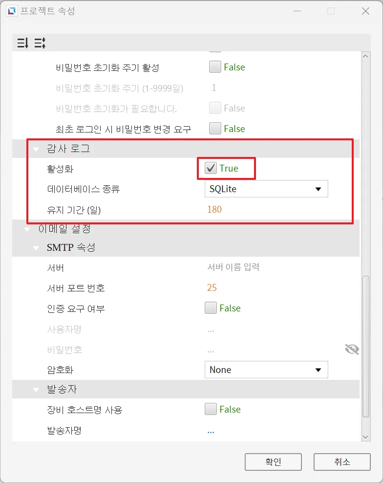섹션 제목: “프로젝트 설정 1”- 디자이너에서 감사 로그를 활성화합니다. 파일 > 프로젝트 속성 > 감사 로그로 이동하여 활성화를 클릭합니다.