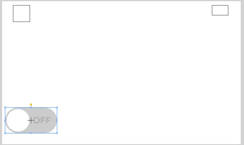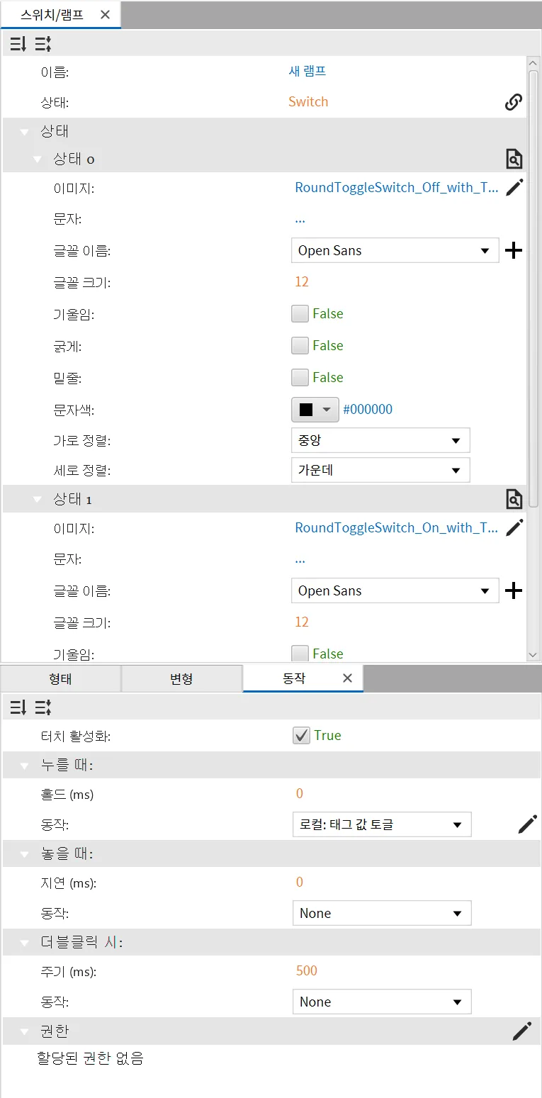 섹션 제목: “토글 버튼”- 토글 버튼 오브젝트를 페이지 좌측 하단에 추가합니다. 배치 후 Switch태그를 클릭하고 길게 눌러 토글 버튼으로 드래그하여 연결하거나, 수동적으로 토글 버튼의 값 속성에Switch태그를 연결하세