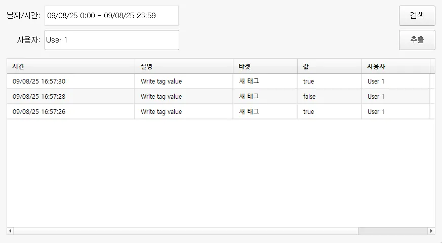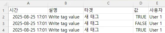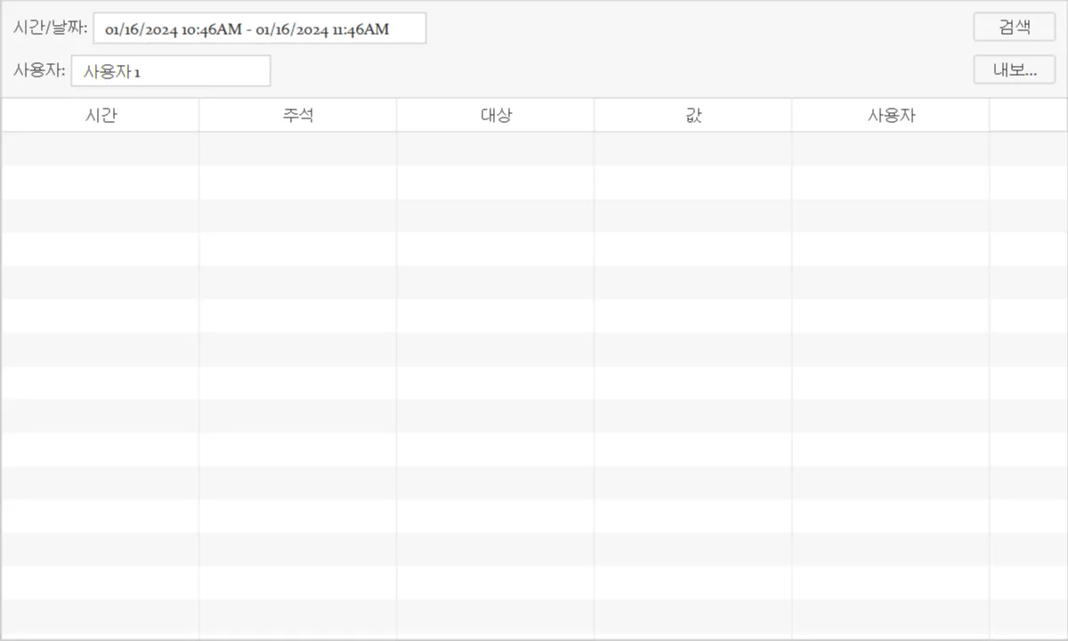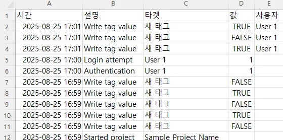 섹션 제목: “기능 설명”감사 로그는 런타임 실행 중 발생하는 모든 사용자 동작을 추적합니다. 태그 값 변경, 로그인 등과 같은 사용자 동작이 감사 로그에 기록됩니다. 이러한 기록은 발생 시간, 동작 설명, 대상, 값 그리고 수행 사용자의 내용으로 구성됩니다.