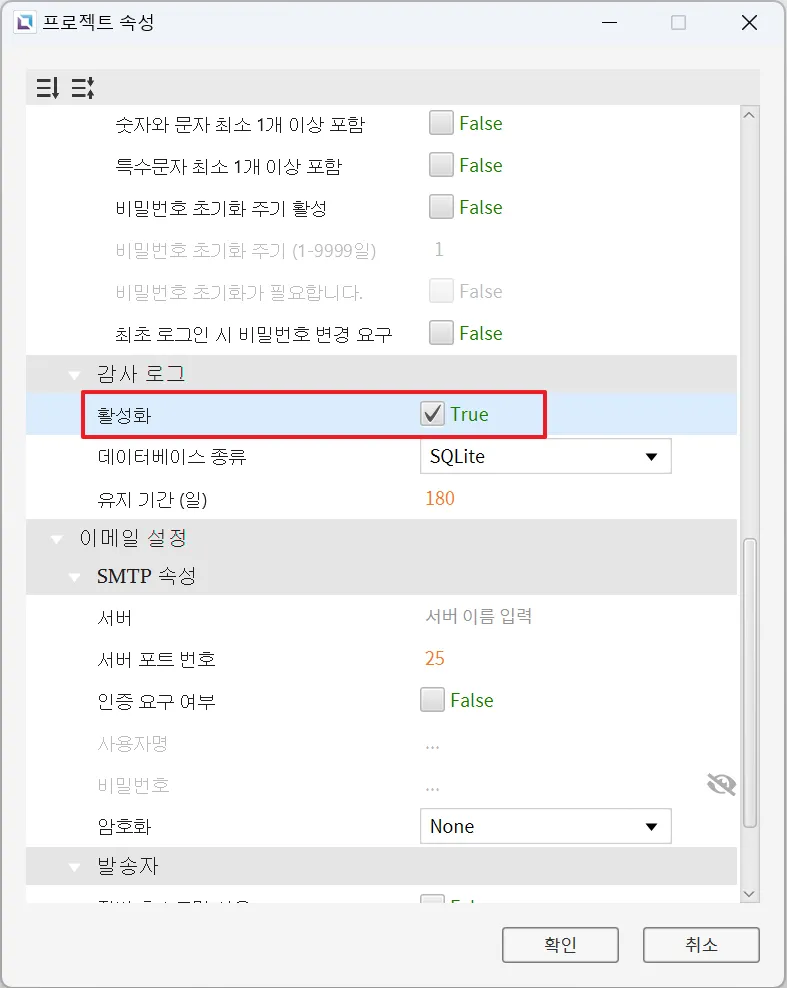 섹션 제목: “디자이너 기능”감사 로그 테이블 오브젝트를 사용하려면 사용자는 반드시 프로젝트 속성 창에서 감사 로그를 활성화 해야 합니다. 파일 > 프로젝트 속성으로 들어가 감사 로그 섹션까지 스크롤을 내린 후, 활성화의 체크박스를 클릭합니다. [^1]
