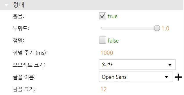 형태 섹션에서는 객체의 가시적인 특성, 글꼴 유형 및 크기, 객체 크기를 변경할 수 있습니다.
