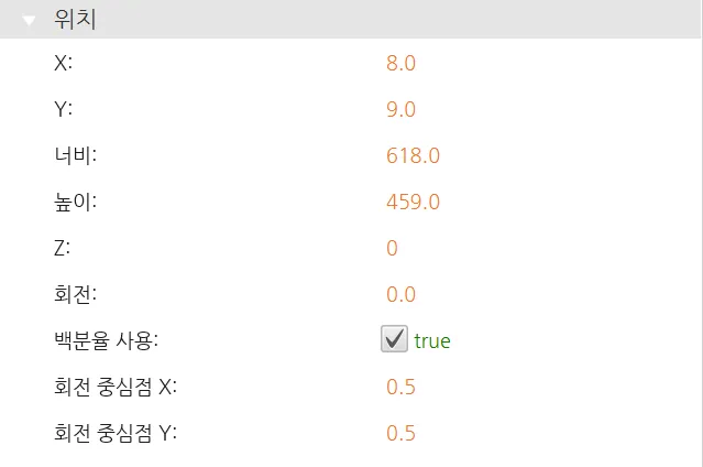 위치 섹션에서는 객체의 모양을 바꾸거나 이동시키는 속성을 조정할 수 있습니다.