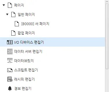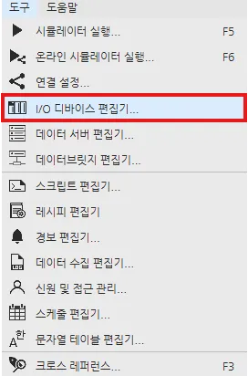 섹션 제목: “I/O 디바이스 설정”- HMI와 PLC 간의 통신을 활성화하려면, 디바이스를 Canvas에 등록해야 합니다. 왼쪽 화면의 프로젝트 트리에서 I/O 디바이스 편집기를 선택하거나 도구 > I/O 디바이스 편집기로 이동하여 엽니다.