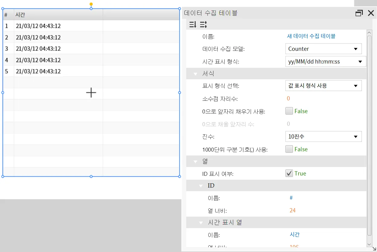 데이터 수집 테이블을 클릭하고 드래그하여 크기를 조절하세요.