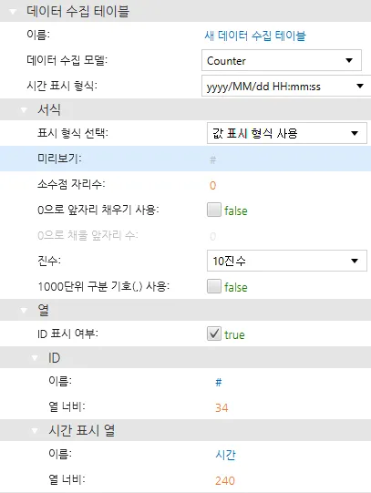 테이블이 생성되면, 해당 테이블을 클릭하고 데이터 수집 모델을 Counter로 설정하세요.