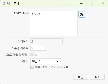 태그 추가 아이콘을 클릭하고 Count 태그를 선택합니다.