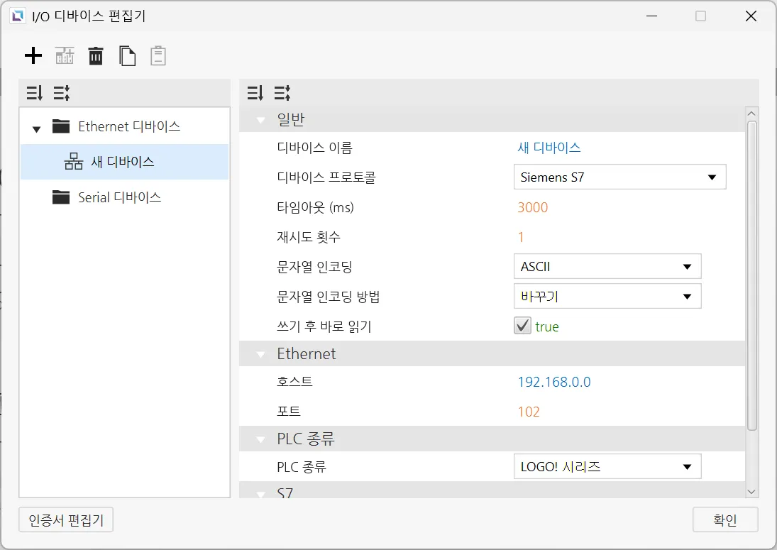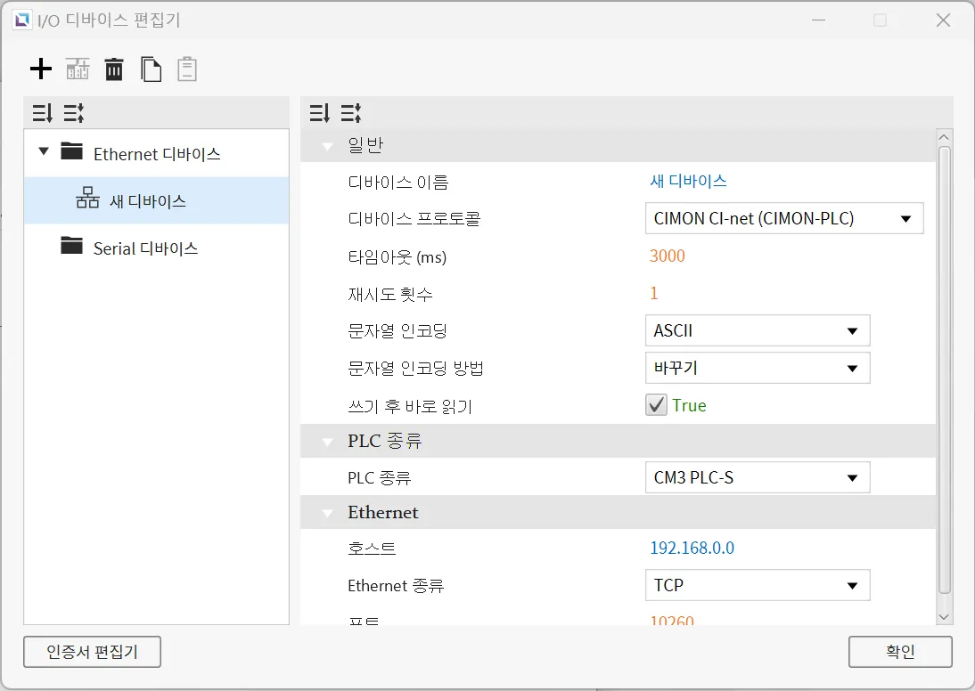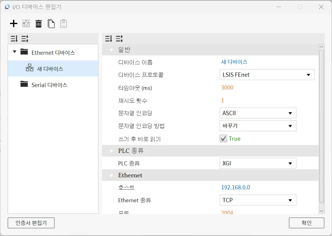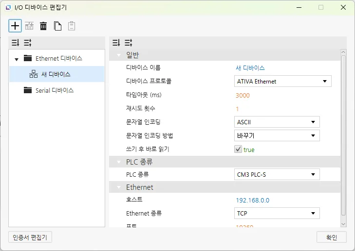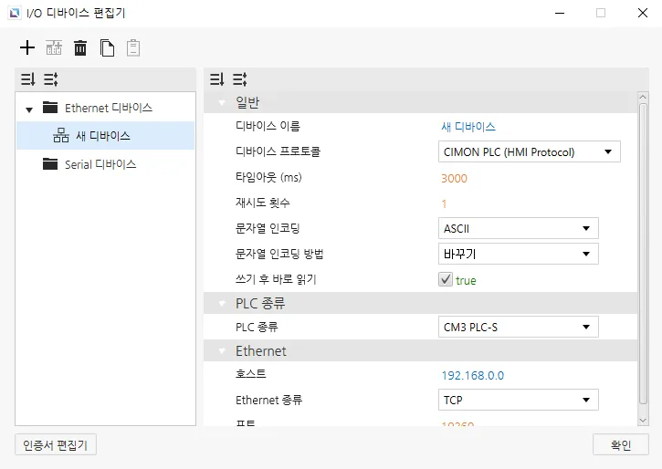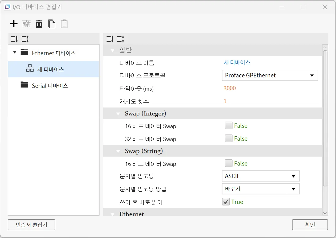 섹션 제목: “Ethernet 디바이스”Ethernet 디바이스는 다른 디바이스와 Ethernet 연결을 통해 접속할 때 사용됩니다. 사용자는 연결할 디바이스의 IP 주소와 Ethernet 종류, 포트를 입력해야 합니다. 선택한 프로토콜에 따라PLC 종류를 설정할 수 있습니다. 문자열 인코딩과 문자열 인코딩 방식도 선택 가능합니다. 이 외에도 타임아웃 시간과 재시도 횟수같은 다른 설정들도 구성할 수 있으며, 디바이스의 이름과 통신 프로토콜도 변경할 수 있습니다.