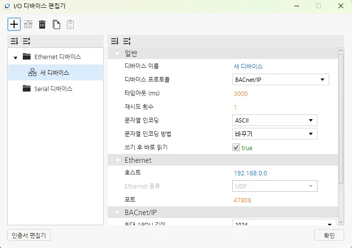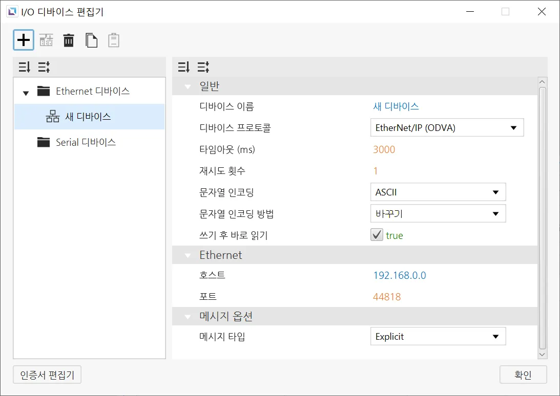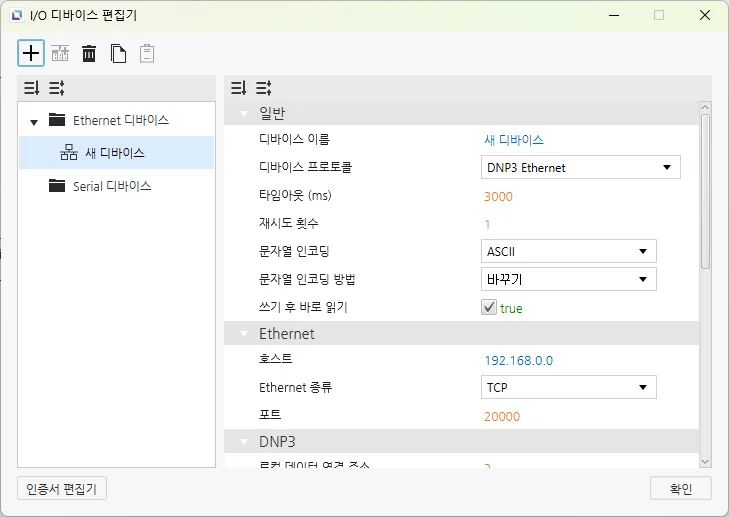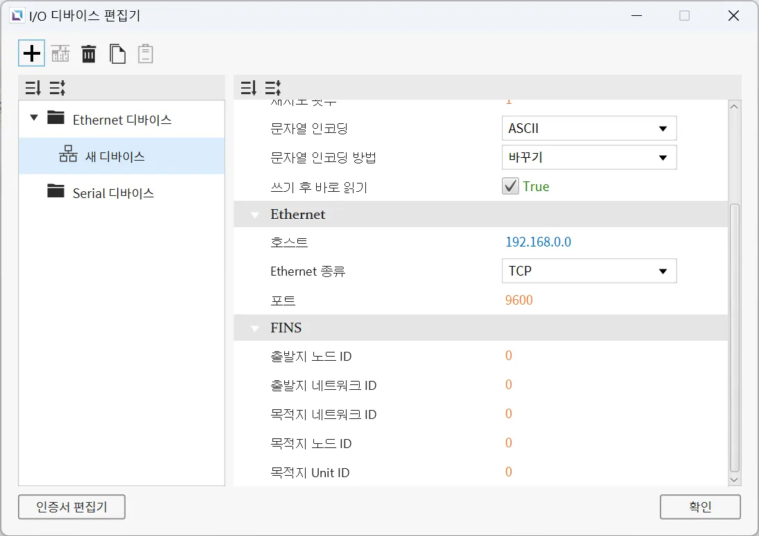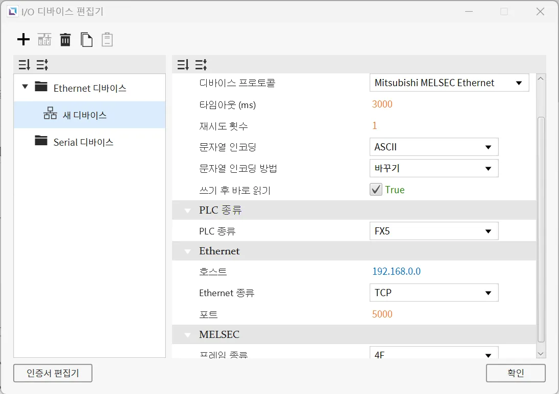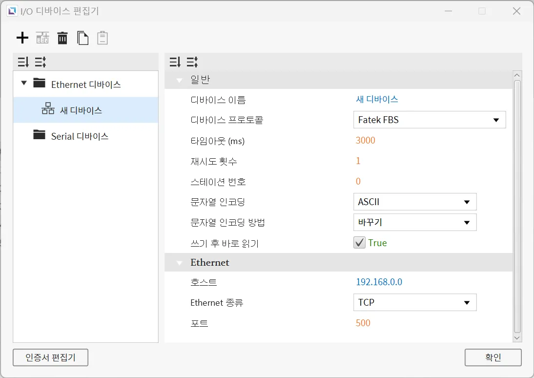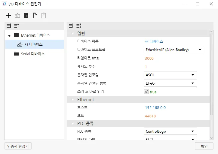 섹션 제목: “Ethernet 디바이스”Ethernet 디바이스는 다른 디바이스와 Ethernet 연결을 통해 접속할 때 사용됩니다. 사용자는 연결할 디바이스의 IP 주소와 Ethernet 종류, 포트를 입력해야 합니다. 선택한 프로토콜에 따라PLC 종류를 설정할 수 있습니다. 문자열 인코딩과 문자열 인코딩 방식도 선택 가능합니다. 이 외에도 타임아웃 시간과 재시도 횟수같은 다른 설정들도 구성할 수 있으며, 디바이스의 이름과 통신 프로토콜도 변경할 수 있습니다.