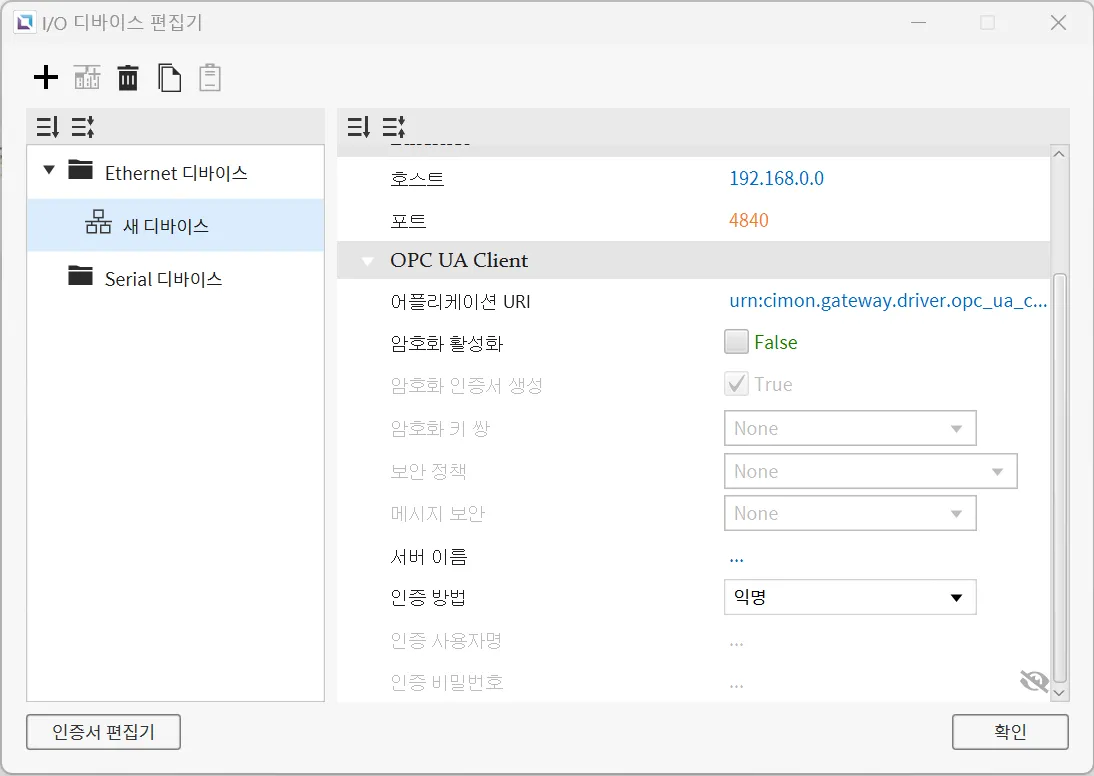 섹션 제목: “OPC UA Client”Canvas는 OPC UA Client 프로토콜을 지원하여 해당 프로토콜을 지원하는 다른 장치들과 연결할 수 있습니다. 사용자는 암호화 활성화를 통해 OPC UA Client의 보안을 강화할 수 있습니다. 또한, 특정 보안 정책을 관리하고 인증 방법을 변경할 수 있습니다.