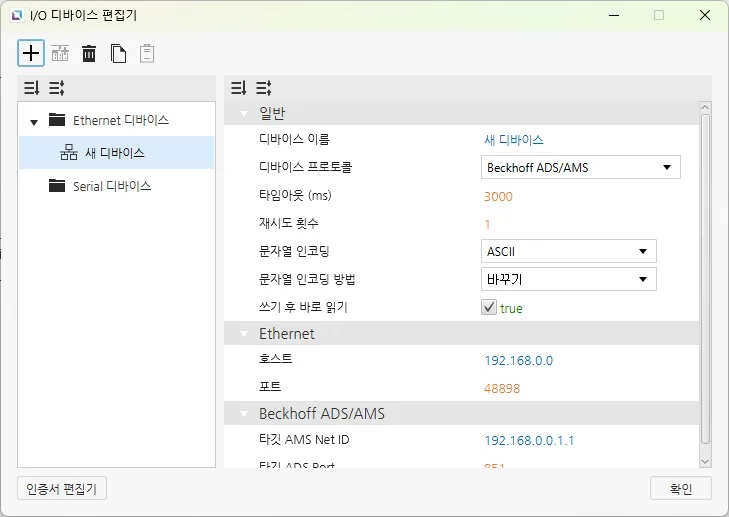 섹션 제목: “Beckhoff ADS/AMS”Canvas는 Beckhoff ADS/AMS 프로토콜을 지원하며, 이 프로토콜을 지원하는 다른 디바이스들과 연결할 수 있습니다. 사용자는 AMS Net ID Target과 ADS Port Target를 설정할 수 있습니다..