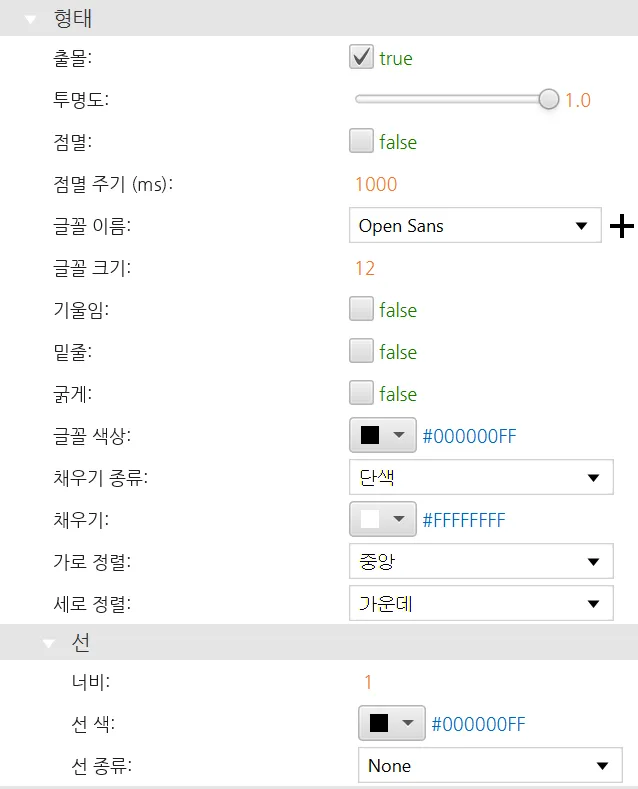 형태 섹션에서는 사용자가 색상을 포함하여 오브젝트의 표시되는 특징을 조정할 수 있습니다.