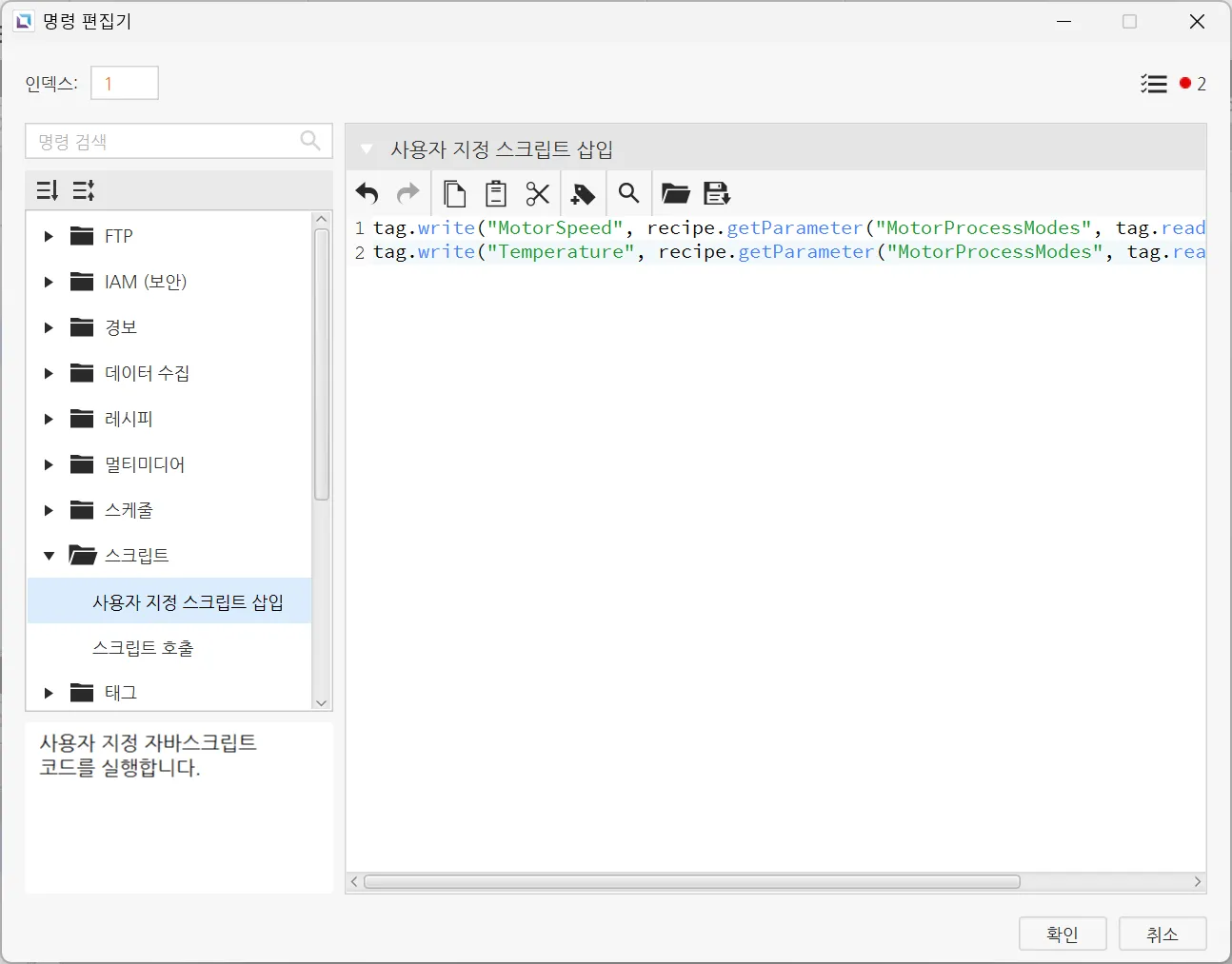 - 명령 편집기 창이 나타나면 왼쪽에서 스크립트 > 사용자 정의 스크립트 삽입을 찾습니다.