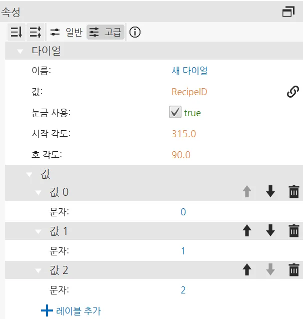 - 다이얼 오브젝트를 삽입합니다. 다이얼 오브젝트의 속성 아래에서 RecipeID를 값에 바인딩하고 총 3개의 값이 되도록 2개의 값을 더 추가합니다. 각 값에 해당하는 인덱스 값으로 레이블을 지정합니다.