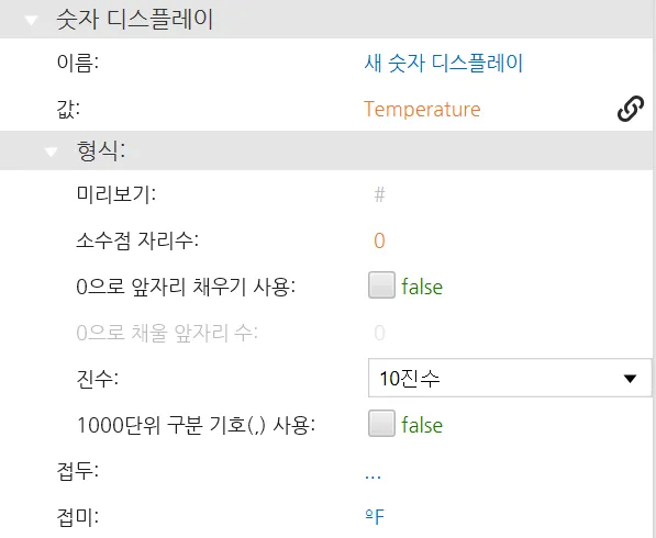 - 숫자 디스플레이 오브젝트를 삽입합니다. 숫자 표시 오브젝트 속성 아래에서 Temperature 태그를 값에 바인딩하고 접미사: °F를 추가합니다.