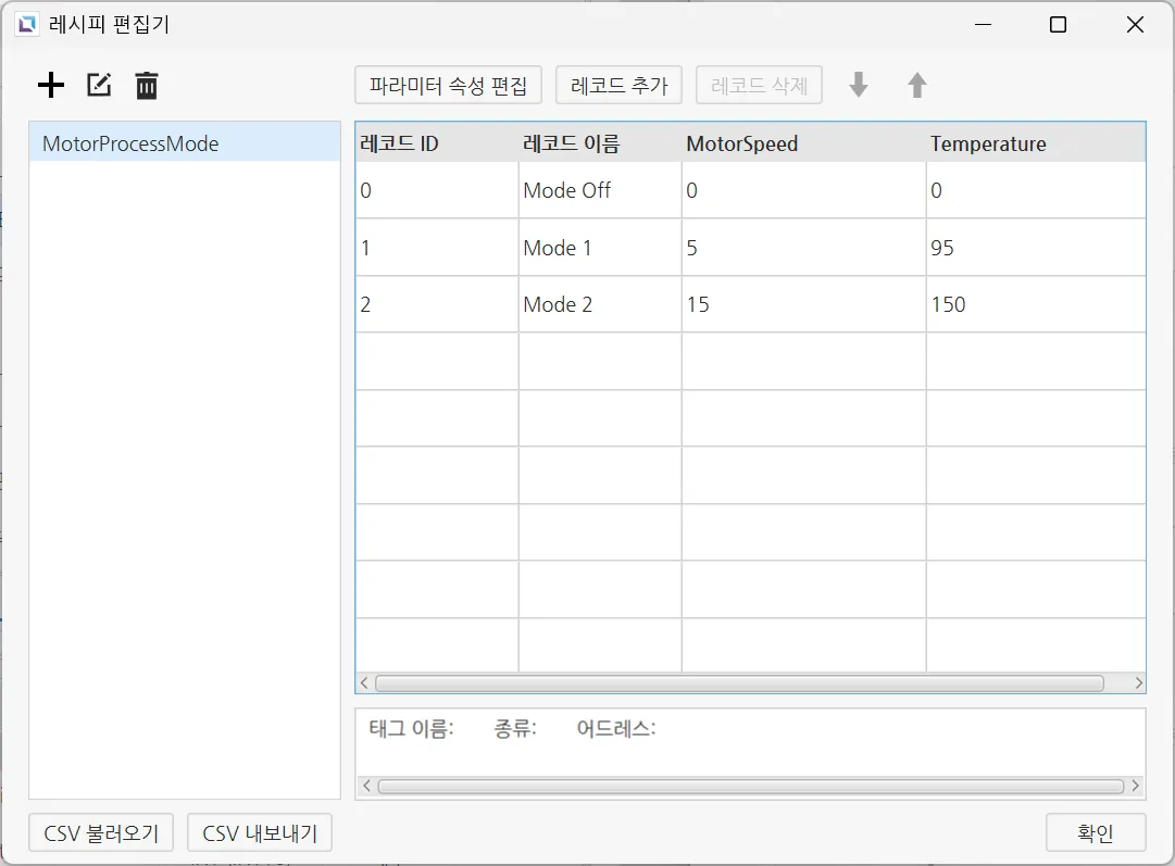 tag.write("MotorSpeed", recipe.getParameter("MotorProcessModes", tag.read("RecipeID"), 0));tag.write("Temperature", recipe.getParameter("MotorProcessModes", tag.read("RecipeID"), 1));