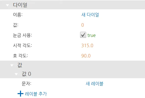 섹션 제목: “기본 속성”기본 속성 섹션을 통해 사용자는 오브젝트의 이름을 구성하고, 초기 값을 설정하고, 눈금 활성화의 표시 여부를 토글하고, 다이얼의 시작 각도와 호 각도를 정의하고, 사용 가능한 값(인덱스) 및 해당 텍스트 레이블을 관리할 수 있습니다.
