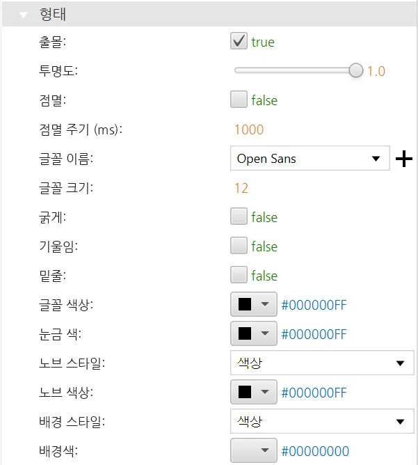 형태 섹션은 다이얼 오브젝트의 시각적 스타일과 모양을 사용자 정의하기 위한 제어 기능을 제공합니다.