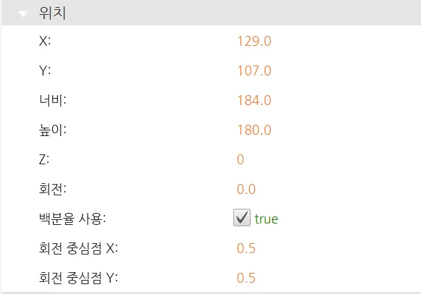 위치 섹션은 다이얼 오브젝트의 크기, 모양 및 위치를 제어하는 조정 가능한 속성을 제공합니다.