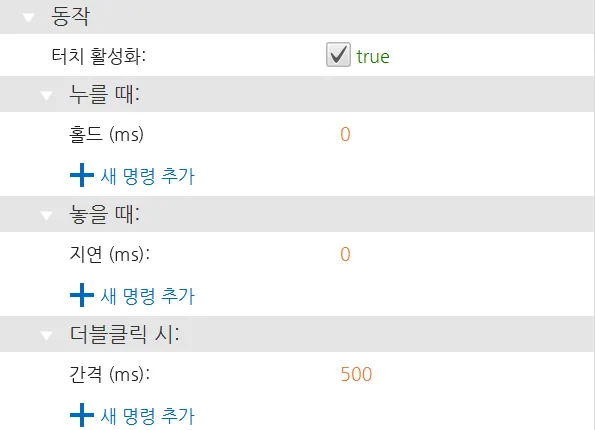 동작 섹션은 다이얼 오브젝트의 상호 작용 동작을 제어합니다. 오브젝트를 누르거나, 떼거나, 두 번 클릭할 때 스크립트 또는 명령이 실행되며, 이 특정 동작은 동작 탭의 누르기 시, 떼기 시 또는 두 번 클릭 시 섹션에서 구성됩니다.
