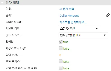 섹션 제목: “프로젝트 설정”- 텍스트 입력 오브젝트와 숫자 입력 오브젝트를 생성합니다. 삽입 > 텍스트 입력을 클릭하거나 도구 모음의 텍스트 입력 삽입 아이콘을 클릭합니다. 페이지에서 클릭하고 드래그하여 텍스트 입력 오브젝트를 추가합니다. 삽입 > 숫자 입력을 클릭하거나 도구 모음의 숫자 입력 삽입 아이콘을 클릭합니다. 페이지에서 클릭하고 드래그하여 숫자 입력 오브젝트를 추가합니다. 태그 'Dollar Amount'를 텍스트 입력 오브젝트에 연결하고 태그 'Int Value'를 숫자 입력 오브젝트에 연결합니다. 두 입력 오브젝트에 대해 화상키보드 사용을 비활성화하는 것을 확인 해야 합니다.