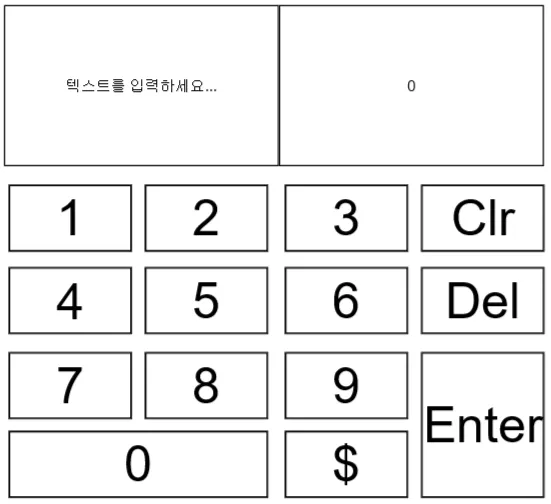 - 사각형 14개와 문자 디스플레이 오브젝트 14개를 생성합니다. 삽입 > 사각형 또는 도구 모음의 사각형 삽입 아이콘을 클릭합니다. 페이지에서 클릭하고 드래그하여 사각형 오브젝트를 만듭니다. 삽입 -> 문자 디스플레이 또는 도구 모음의 문자 디스플레이 삽입 아이콘을 클릭합니다. 페이지를 클릭하고 드래그하여 Text Entry 오브젝트를 불러옵니다. 키패드와 유사한 모양이 되도록 배치한 후, 다음과 같은 텍스트를 설정합니다: 1, 2, 3, 4, 5, 6, 7, 8, 9, 0, $, Clr, Del, Enter.