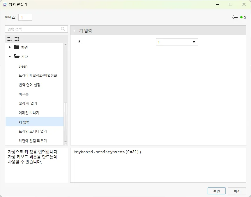 - 입력 키를 선택한 후 동작 탭으로 이동합니다. 각 입력 키에 대해 누를 때 동작을 설정합니다. 새 명령 추가 후 명령 편집기에서 동작의 명령 종류를 키 입력으로 설정합니다. 키의 파라미터는 해당하는 숫자 또는 기호로 설정합니다. 아래에 1번 키의 명령 편집기 예시가 나와 있습니다.