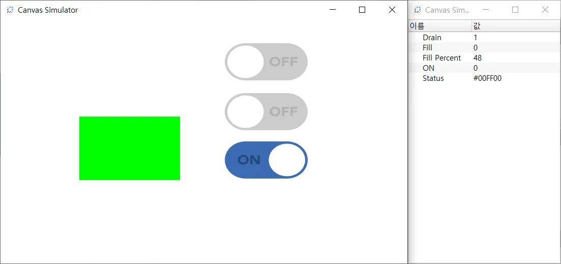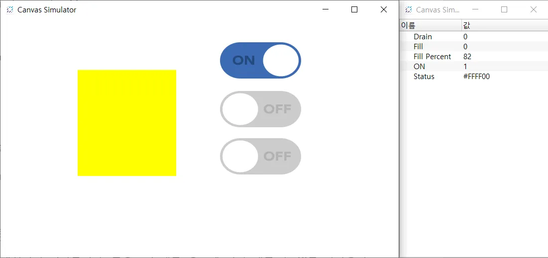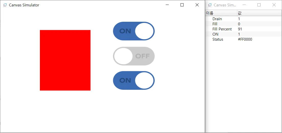 - ON 버튼을 클릭여 토글 한 후, Fill 버튼을 토글합니다. 그러면 사각형 (채우기)의 증수가 시작합니다. 물탱크의 채움 정도에 따라 사각형 (채우기)이 노란색과 빨간색으로 변경됩니다.