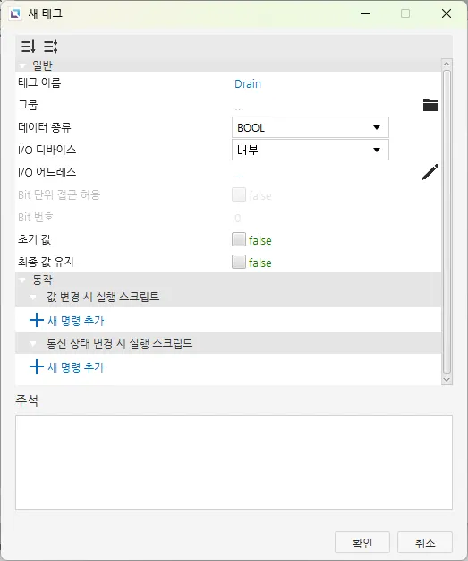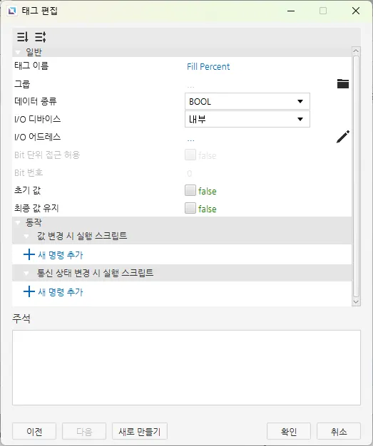 tag.write("ON", !tag.read("ON"));thread.msleep(100);while(tag.read("ON")){ if(tag.read("Fill")){ if(tag.read("Fill Percent") < 100){ tag.write("Fill Percent", tag.read("Fill Percent") + 1); } } else if(tag.read("Drain")){ if(tag.read("Fill Percent") > 0){ tag.write("Fill Percent", tag.read("Fill Percent") - 1); } } if(tag.read("Fill Percent") < 79){ tag.write("Status", "#00FF00"); } else if(tag.read("Fill Percent") >= 79 && tag.read("Fill Percent") < 89){ tag.write("Status", "#FFFF00"); } else if(tag.read("Fill Percent") >= 89){ tag.write("Status", "#FF0000"); } thread.msleep(300);}프로젝트 설정 2