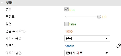섹션 제목: “프로젝트 설정 1”- 사각형 (채우기) 오브젝트를 생성합니다. "Fill Percent" 태그를 기본 속성 탭의 값에 연결하고, "Status" 태그를 형태 탭의 채우기 매개변수에 연결합니다.