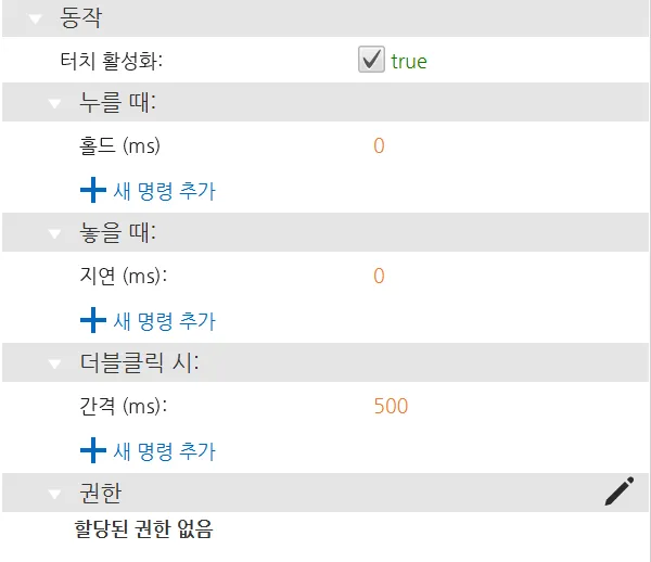 사각형 (채우기)이 눌리거나, 놓이거나, 더블 클릭될 경우 동작 버튼이 스크립트나 명령을 실행합니다. 이는 동작 섹션의 누를 때:, 놓을 때:, 더블 클릭 시: 섹션에서 제어됩니다.