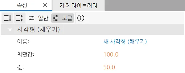 섹션 제목: “기본 속성”기본 속성 섹션에서는 오브젝트 내 표시되는 콘텐츠와 형식을 변경할 수 있습니다. 사용자는 이 섹션에서 사각형 (채우기)의 최대 값과 기본 값을 설정할 수 있습니다. 오브젝트의 이름은 아래 그림과 같이 기본 속성 대신 표시됩니다.