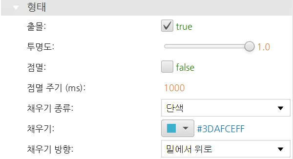 형태 섹션에서는 선택 항목을 사용하여 보이는 특성을 변경할 수 있습니다.