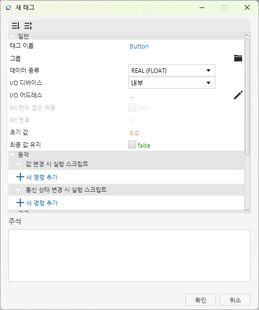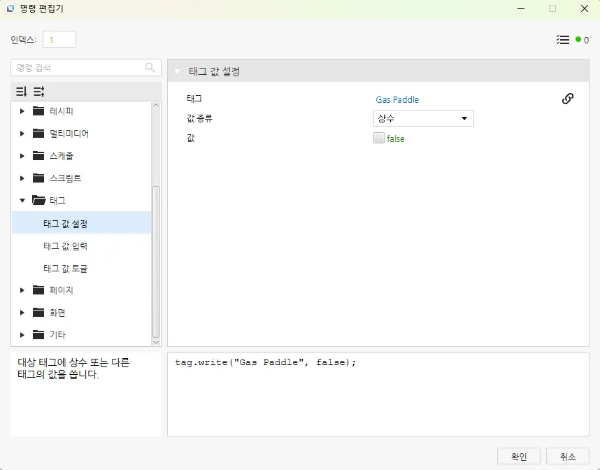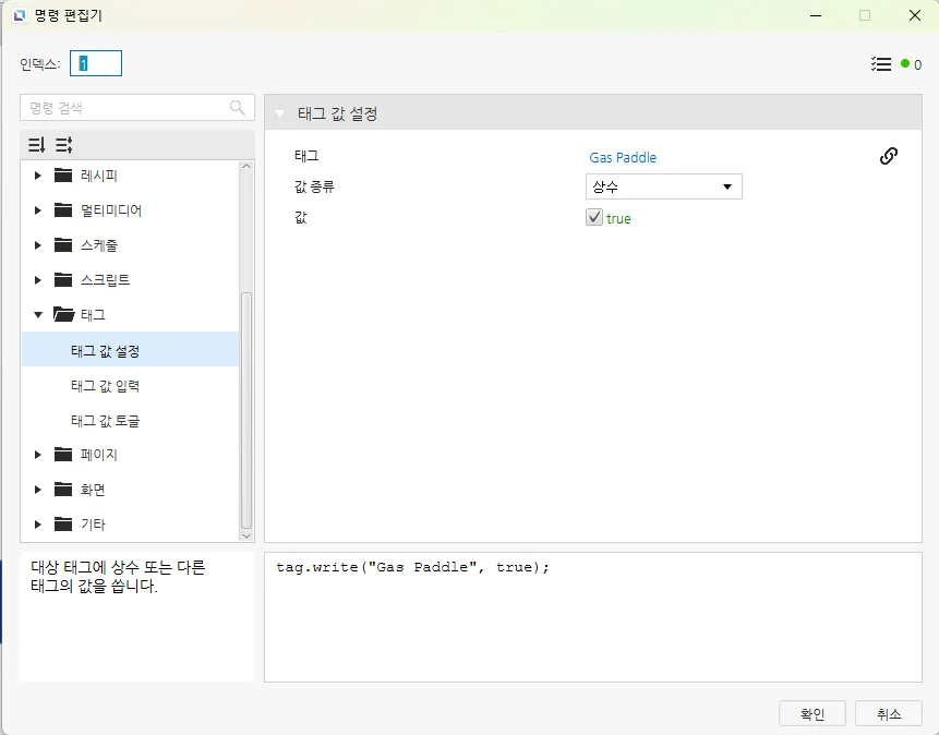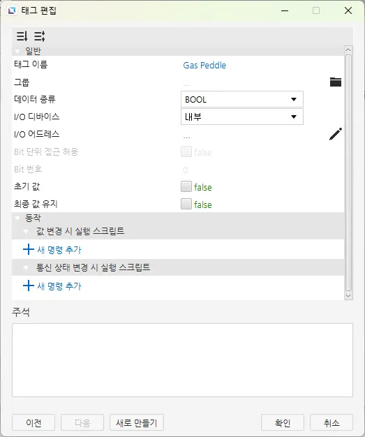 [순간 값 버튼] – [동작] – [누를 때, 놓을 때] – [동작] – [새 명령 생성] – [새 명령 추가] – [태그 값 설정] – [태그] – [Gas Peddle], 누를 때 : true, 놓을 때 : false