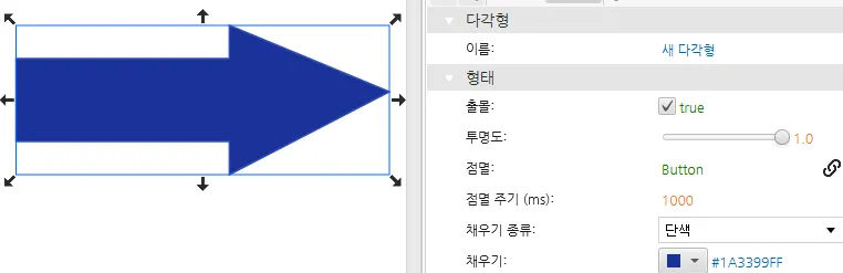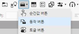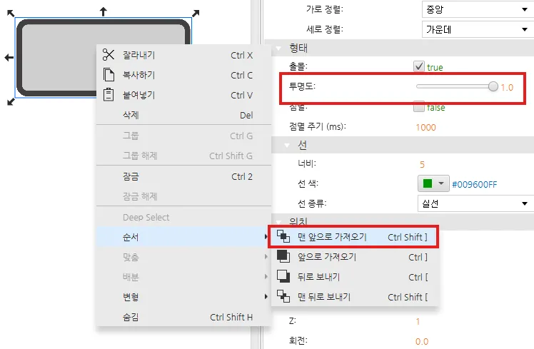[파란색 화살표] - [형태 창] - [투명도] : button 태그 연결