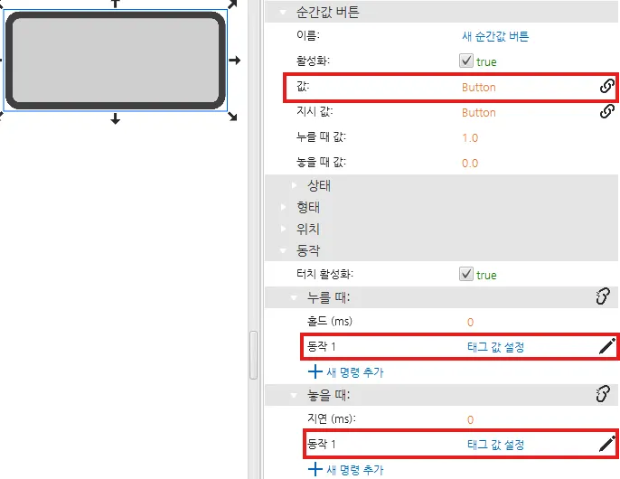 [순간 값 버튼] – [기본 속성] – [태그] : button 태그 연결