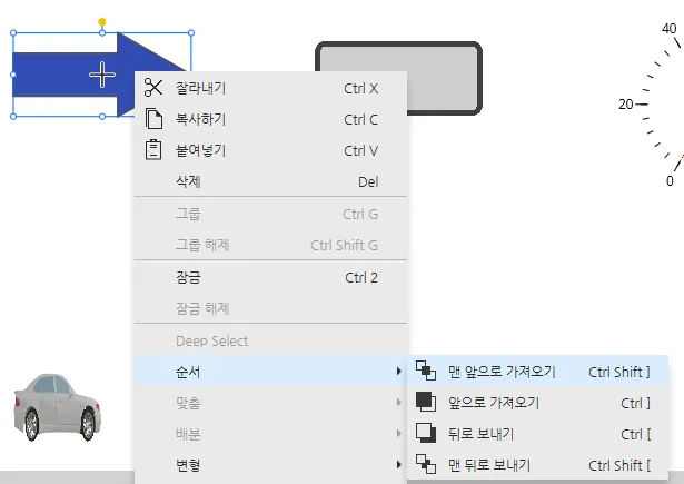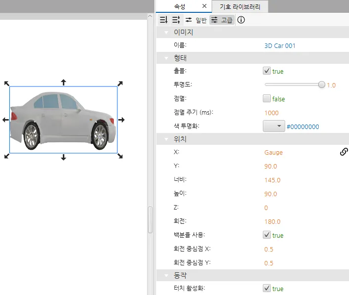 while (1) { if (tag.read("Gas Peddle")){ tag.write("Gauge", tag.read("Gauge") + 1); } thread.msleep(50)}- 이 명령은 다음 섹션의 오브젝트에 사용됩니다. 화살표를 길게 누르면 차량이 오른쪽으로 이동하며 게이지도 움직이며, 화살표에서 마우스를 놓으면 차량이 왼쪽으로 이동하는 동시에 게이지도 원상태로 돌아옵니다.