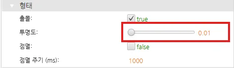 순간 값 버튼을 화살표 위에 올려놓은 후 불투명도를 0.01로 변경합니다. 또한 순서를 변경하여 앞쪽으로 가져옵니다.