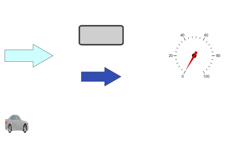 섹션 제목: “프로젝트 설정”- 벡터 심볼 라이브러리 화살표 2개, 순간 값 버튼, 기호 라이브러리의 자동차, 마지막으로 원형 게이지 등 5개의 오브젝트를 화면에 만듭니다.