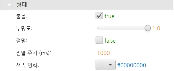 형태 섹션에서는 사용자가 오브젝트의 시각적 특성을 변경할 수 있습니다.
