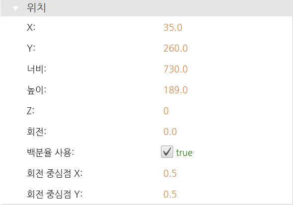 위치 섹션에서는 오브젝트의 모양을 바꾸거나 이동시키는 조정 가능한 속성을 제공합니다.