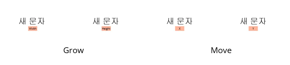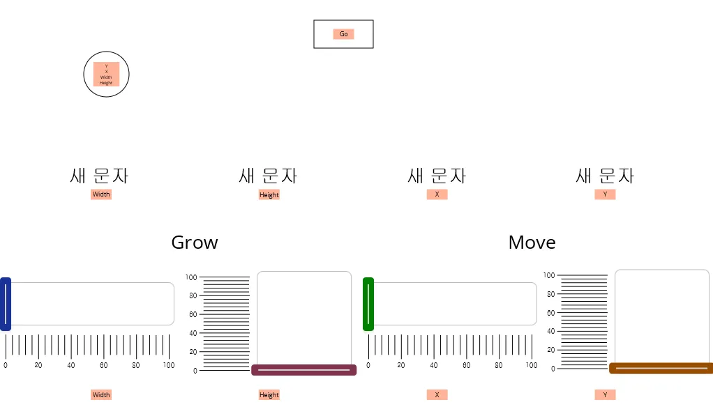 - 문자 디스플레이 두개를 배치합니다. 크기 조절 컨트롤 아래에는 “Grow”, 위치 조절 컨트롤 아래에는 “Move” 로 변경하세요.