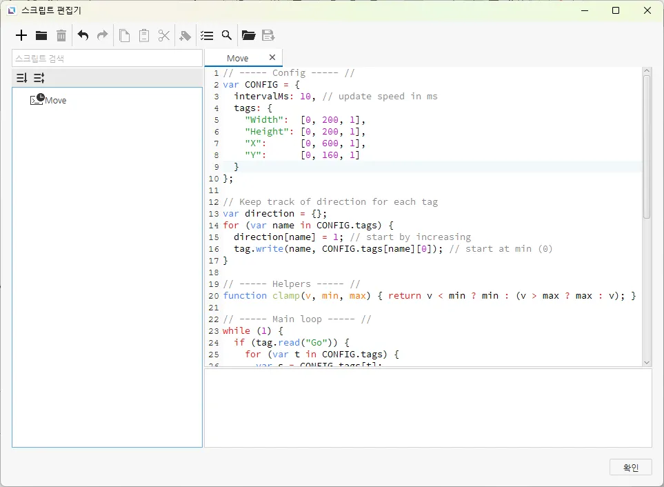 // ----- Config ----- //var CONFIG = { intervalMs: 10, // 업데이트 속도 (밀리초) tags: { "Width": [0, 200, 1], "Height": [0, 200, 1], "X": [0, 600, 1], "Y": [0, 160, 1] }};