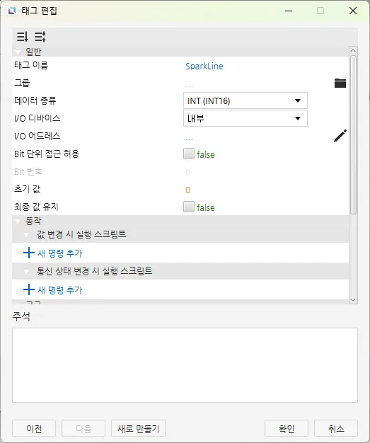 while (1) { if (tag.read("Right Button")){ tag.write("SparkLine", tag.read("SparkLine") + 1); } thread.msleep(50)}- Left Button 스크립트에 다음 코드를 붙여 넣습니다.